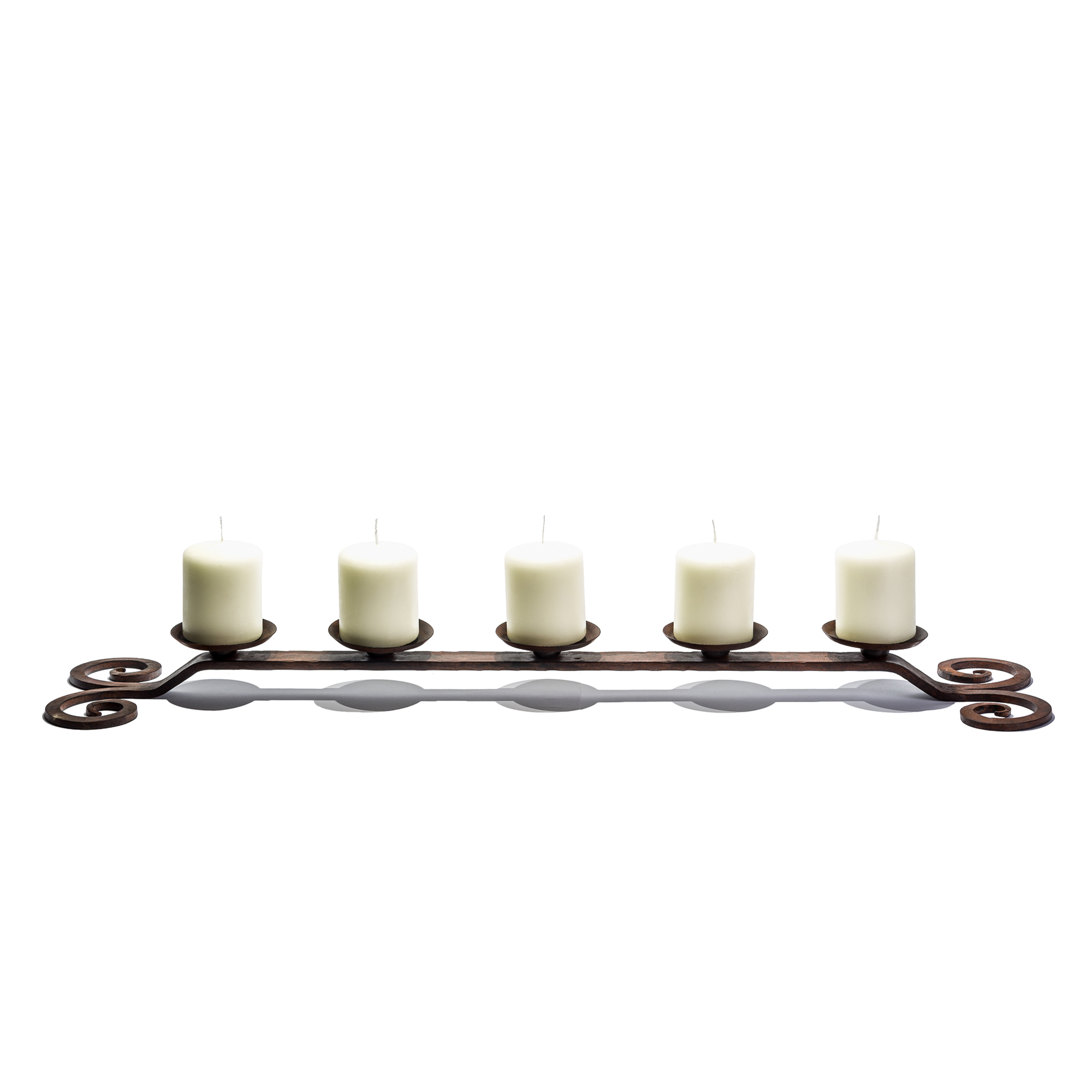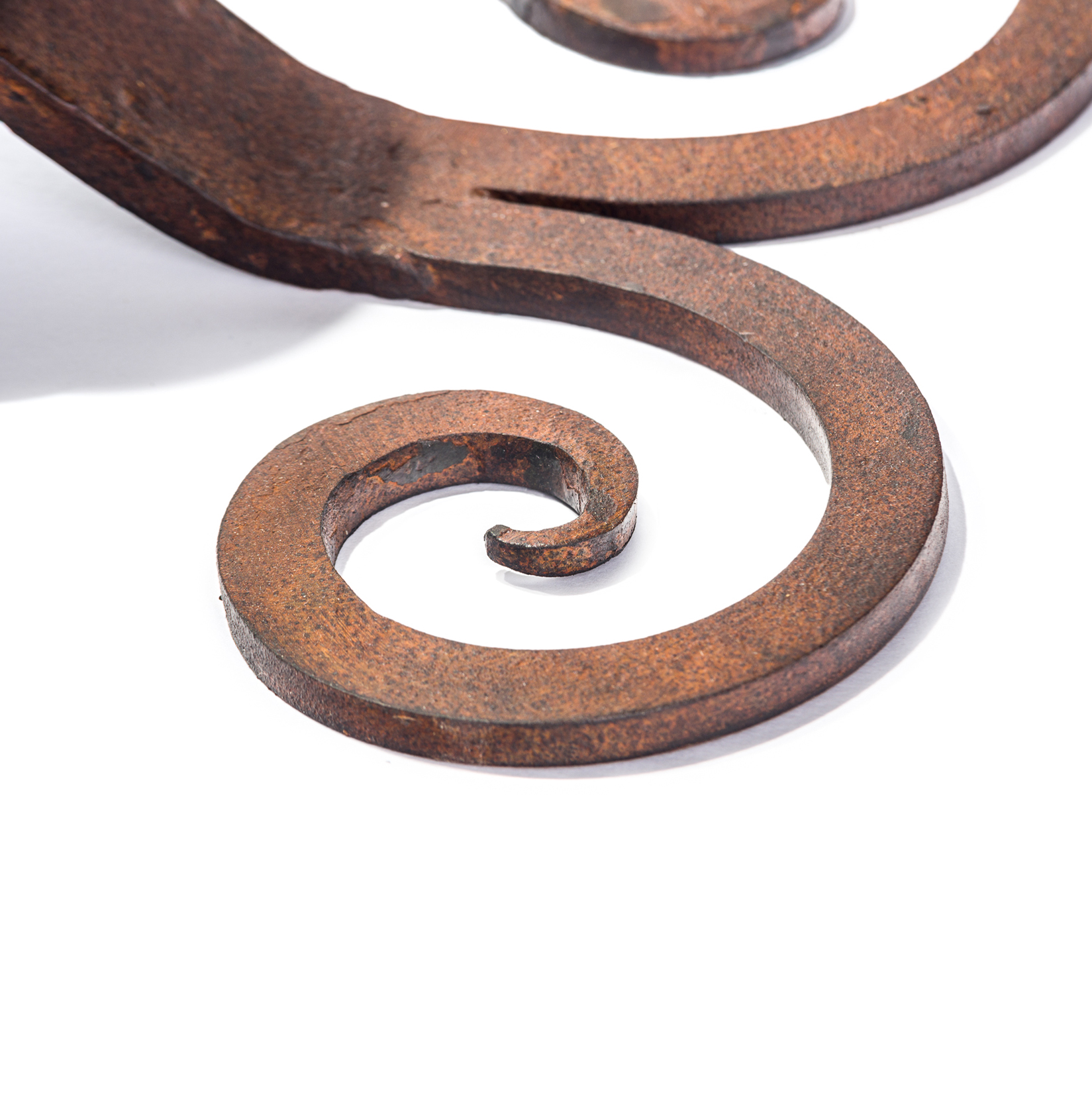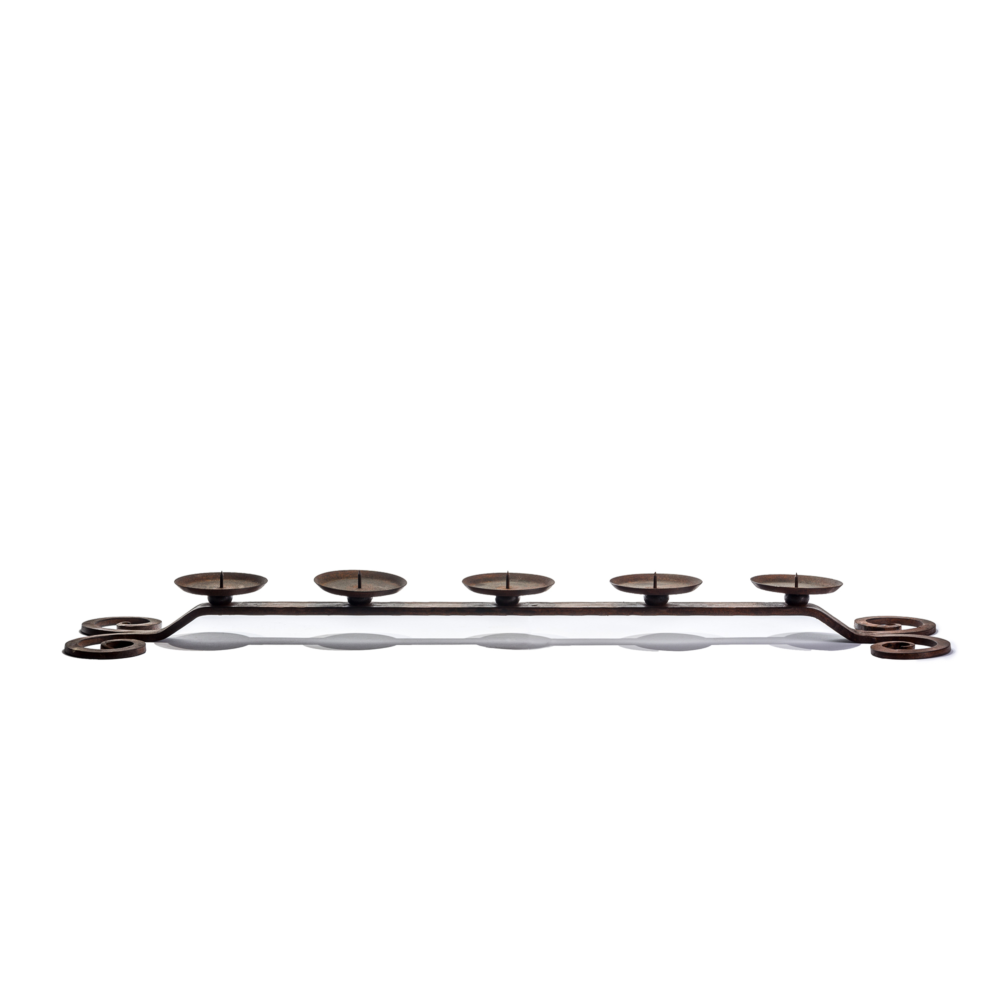 Wrought iron table candlestick on a rised orizontal base leaning against two forged curls. Suitable for round candles. Rust colour.