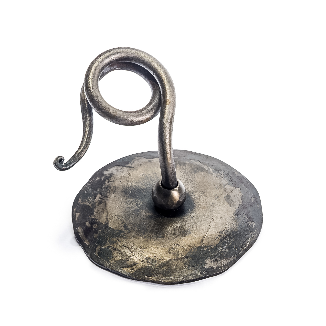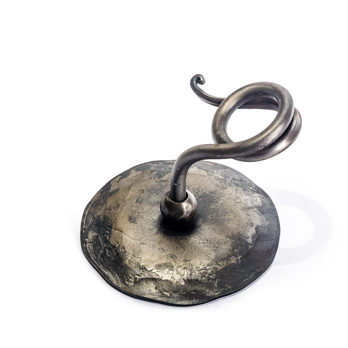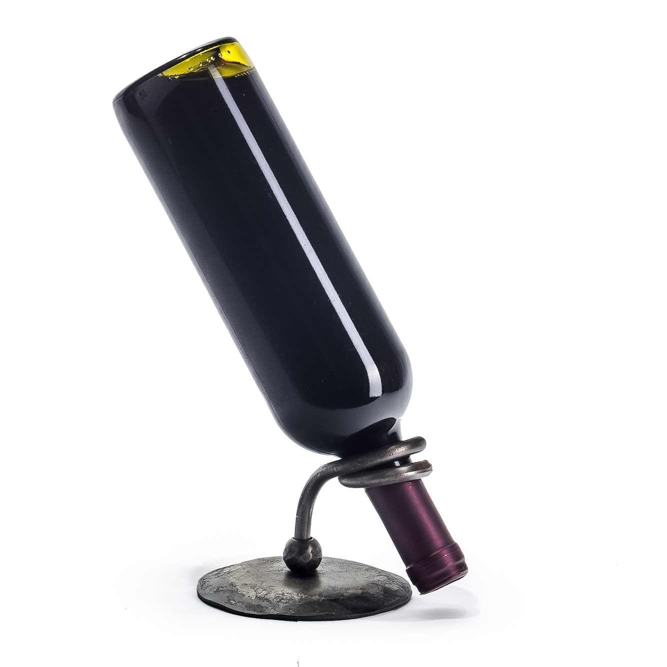 Wrought iron bottle holder for table, with a circular base and a knotted forged iron support.