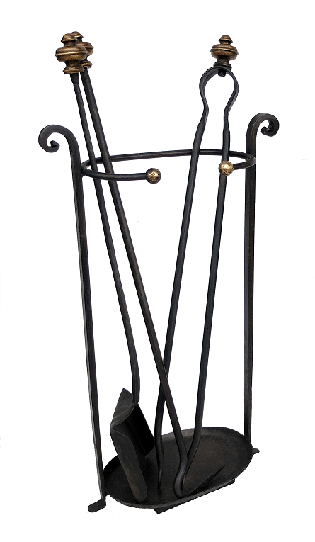 FIREPLACE SET IN FORGED IRON WITH BRONZE DECORATION.