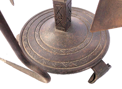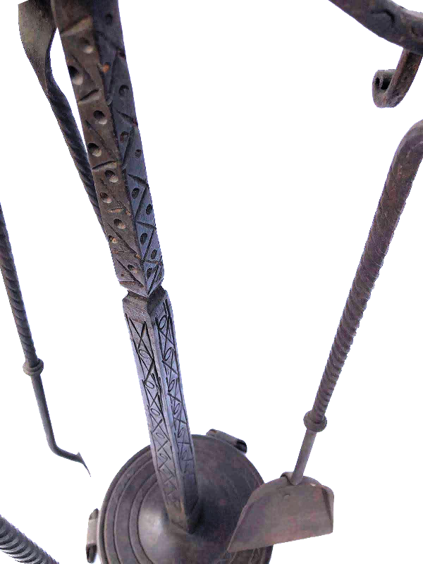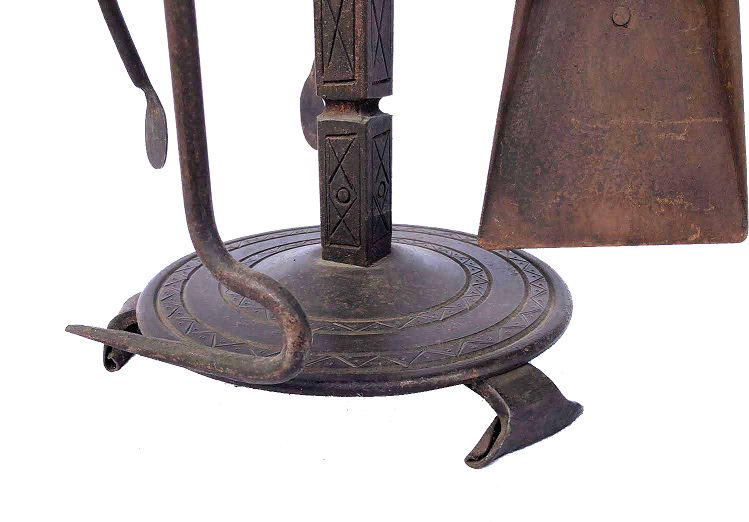 FIREPLACE SET WITH HAND-CARVED CARVINGS AND HANDMADE BRONZE BALL.