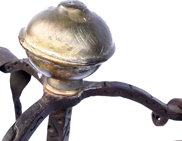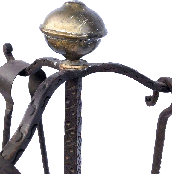 SET DA CAMINO CON INTAGLI REALIZZATI A MANO E PALLA DI BRONZO LAVORATA ARTIGIANALMENTE.