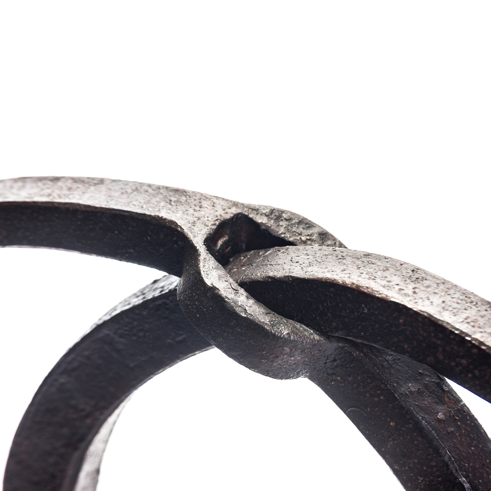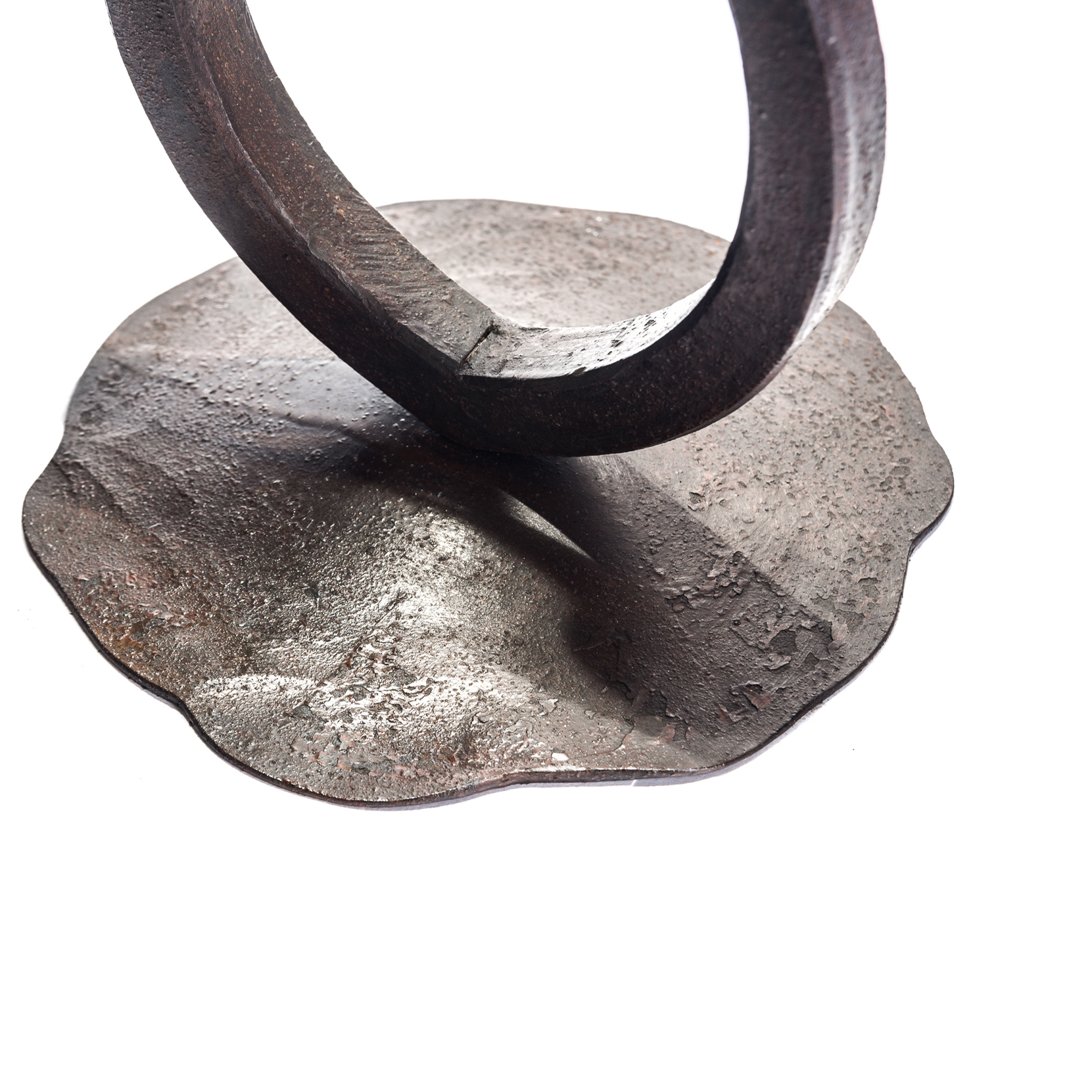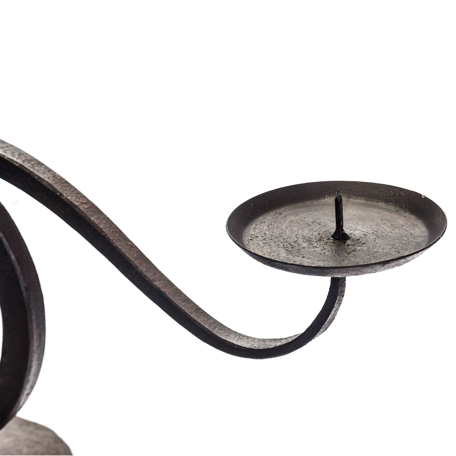 Candeliere da tavolo in ferro battuto a due fiamme, completo di candele, con bracci intersecati formanti un motivo a fiocco. Colore effetto ruggine.