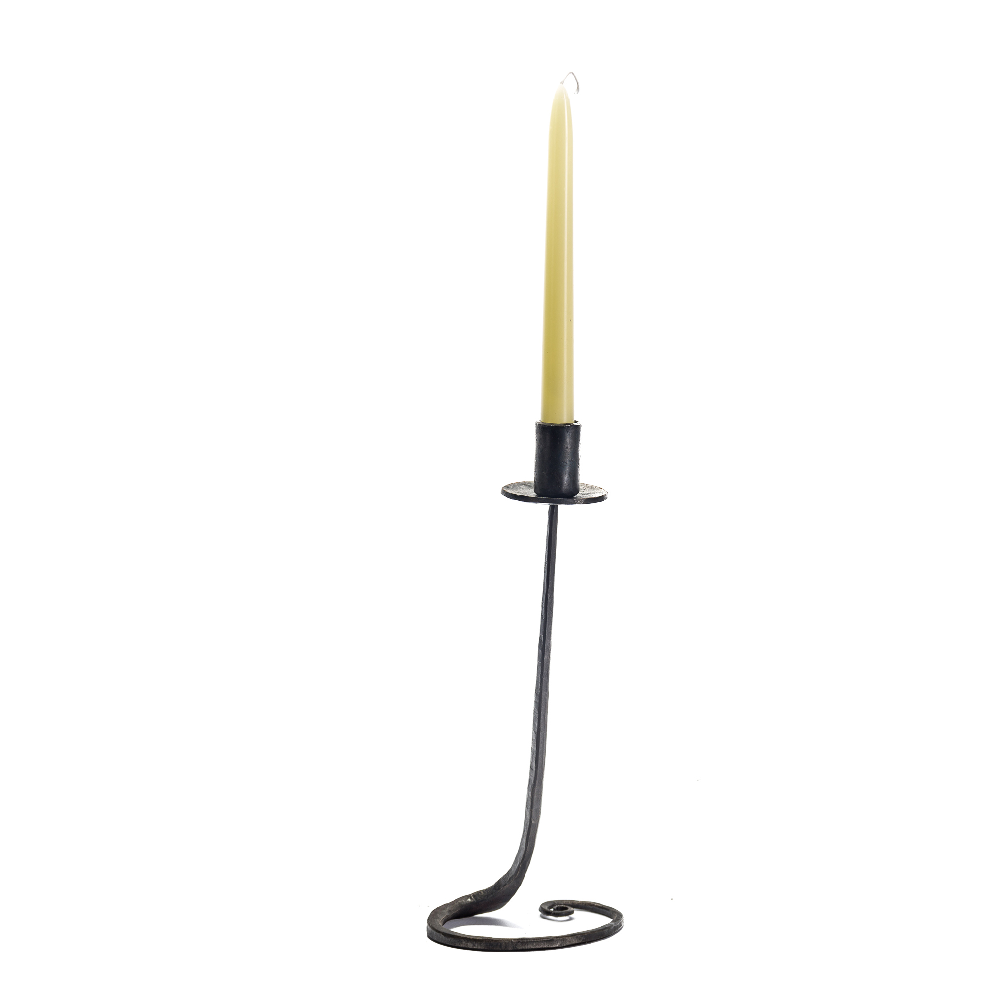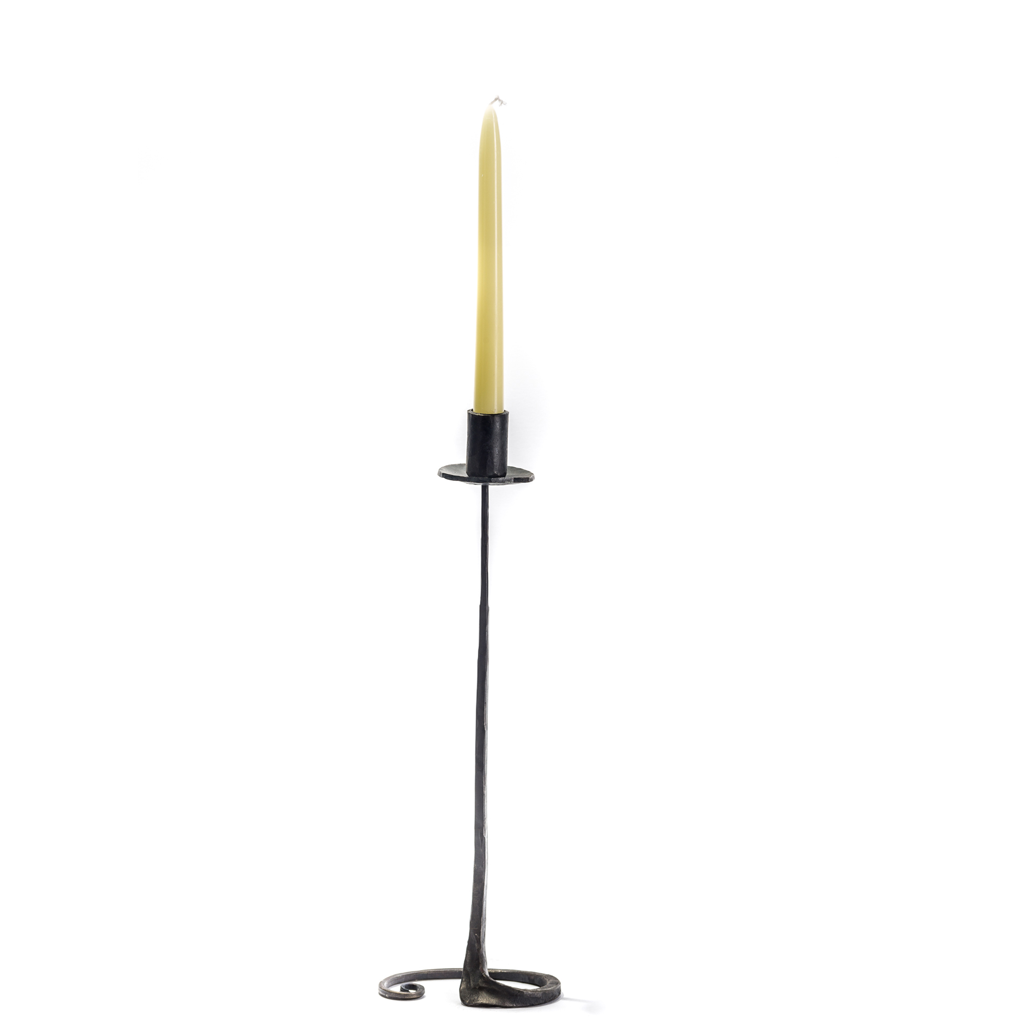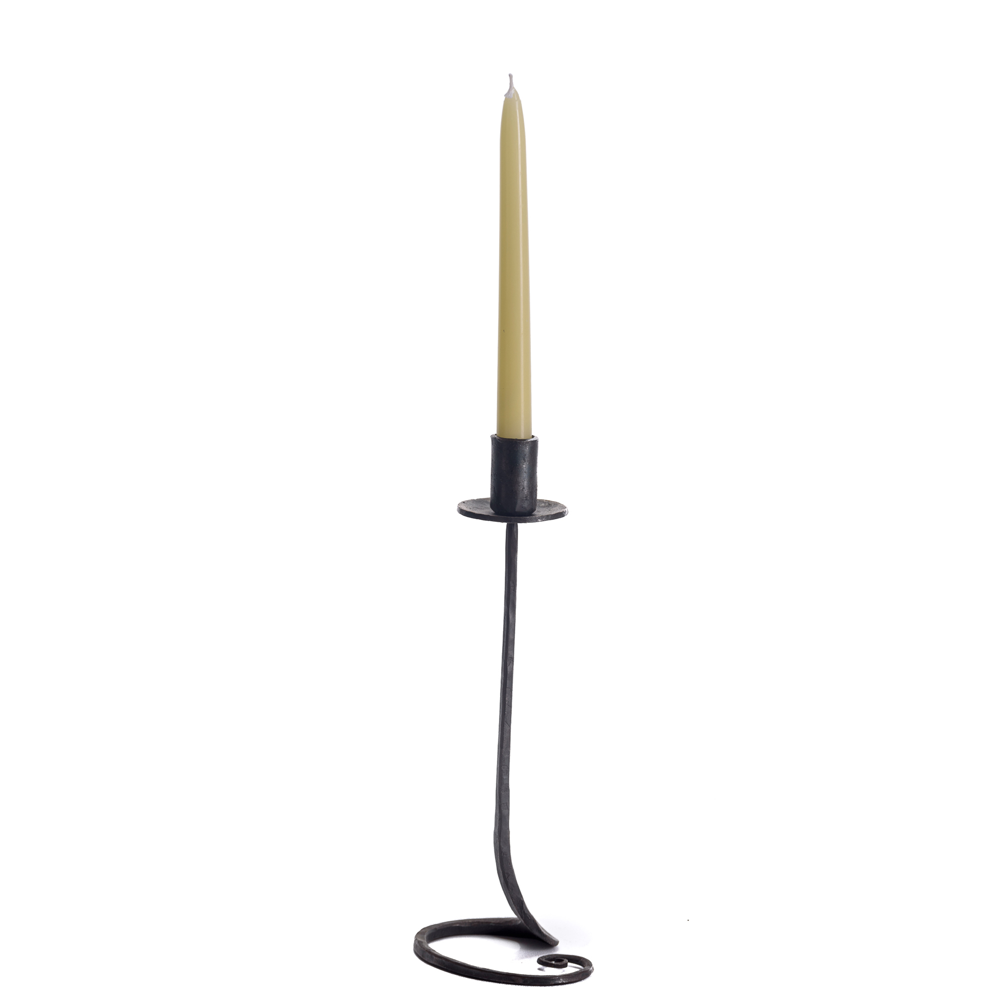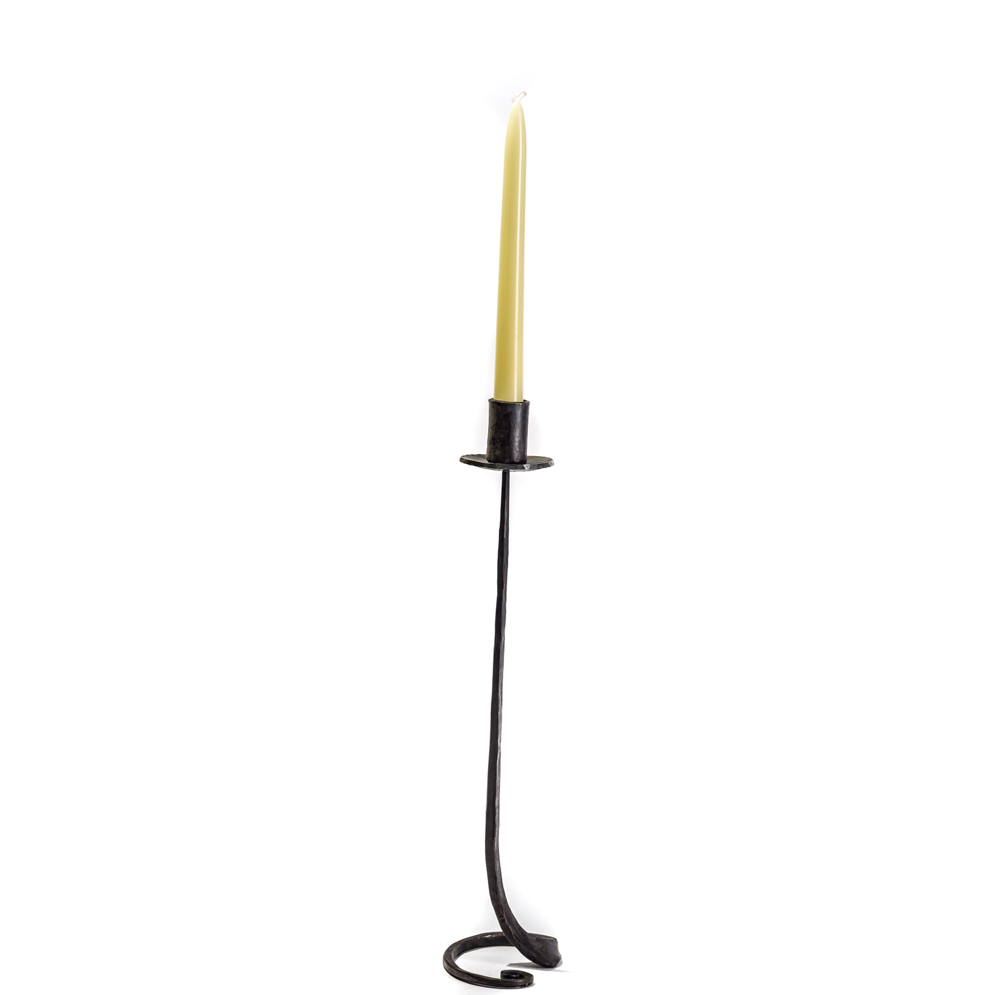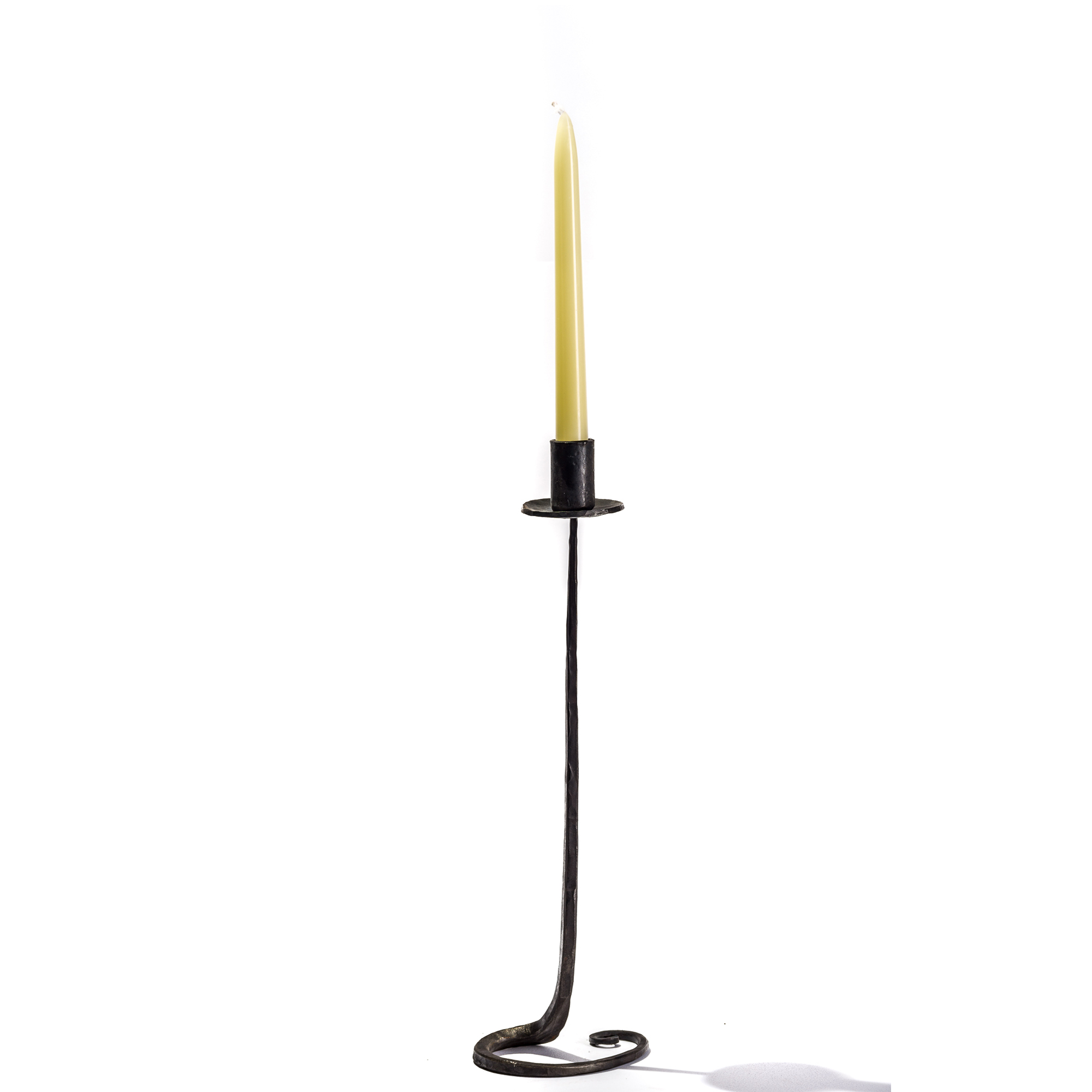 Candeliere da tavolo in ferro battuto a una fiamma con fusto dritto e piedistallo a ricciolo. Adatto per candele lunghe.