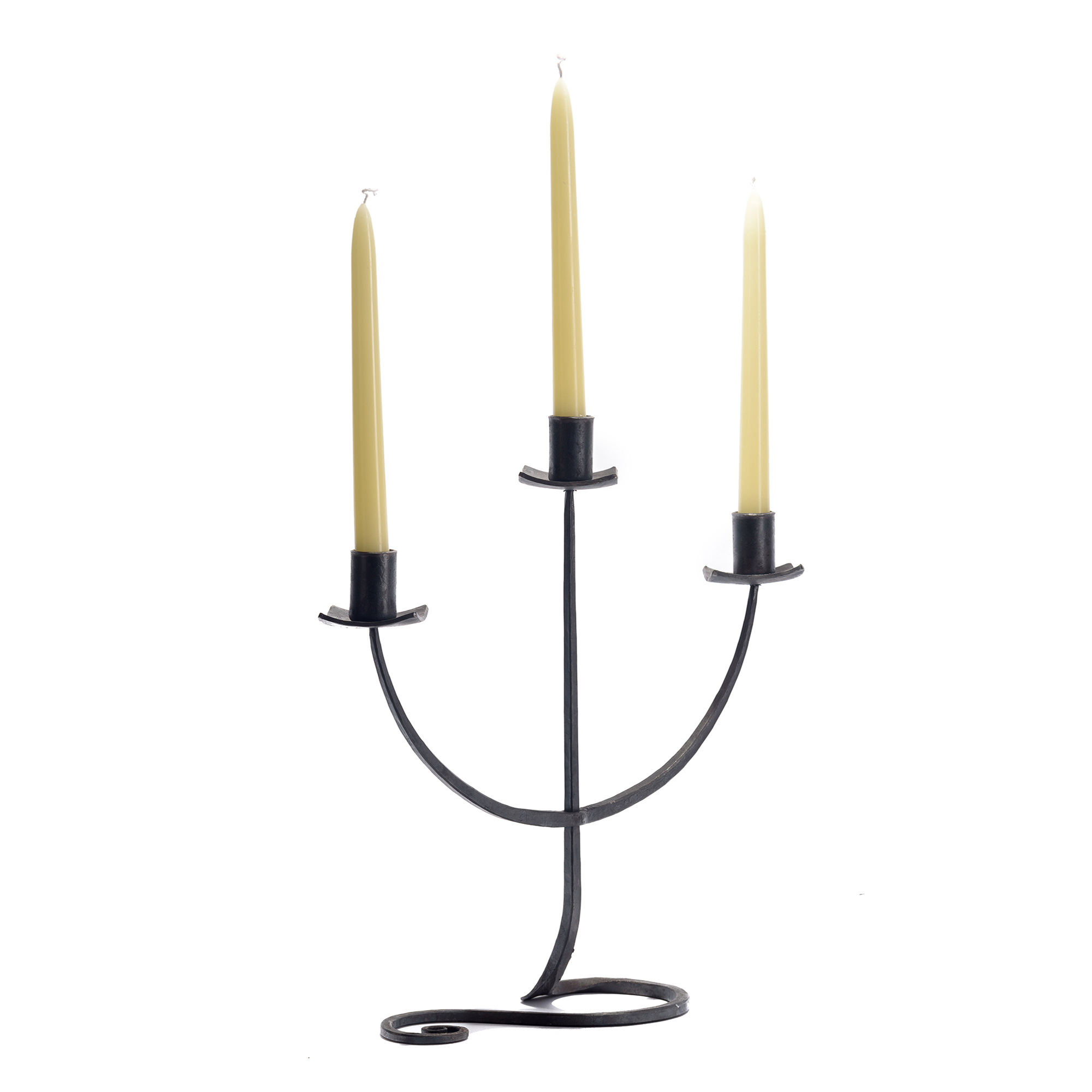 Candeliere da tavolo in ferro battuto a forma di tridente con piedistallo a ricciolo. Adatto per candele lunghe.