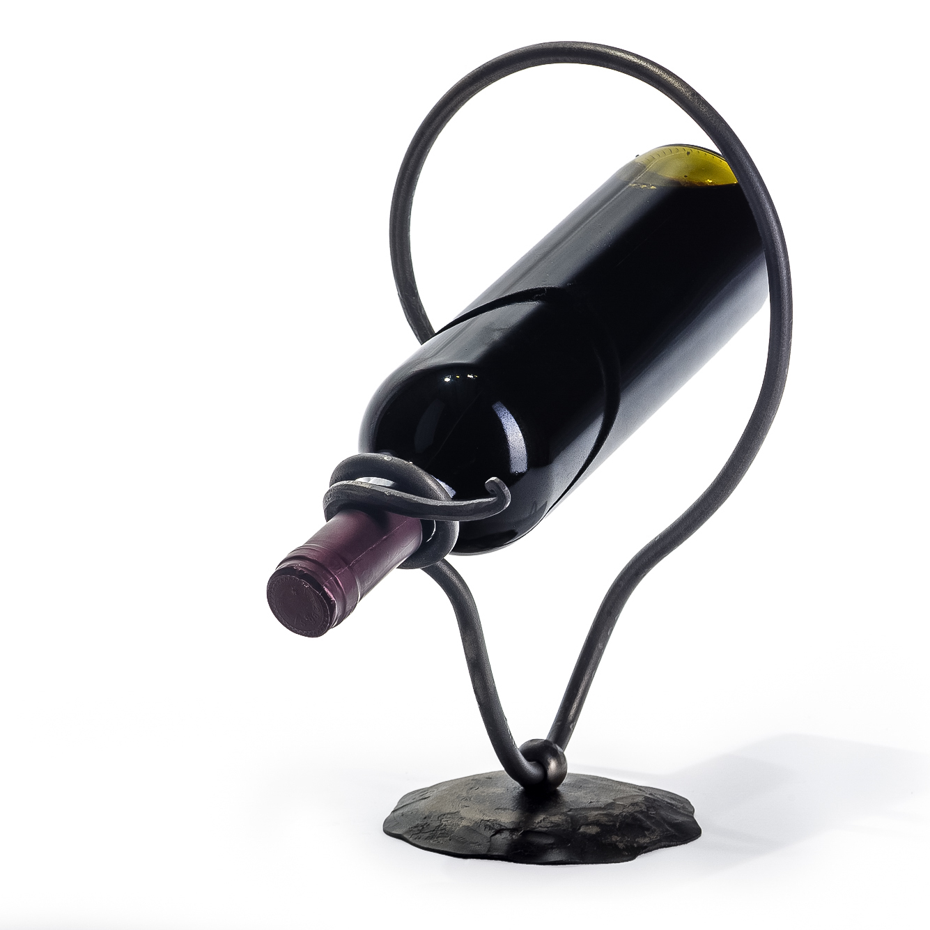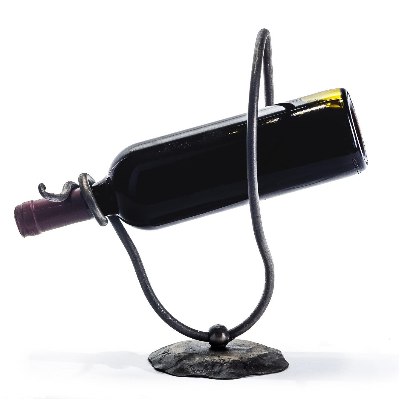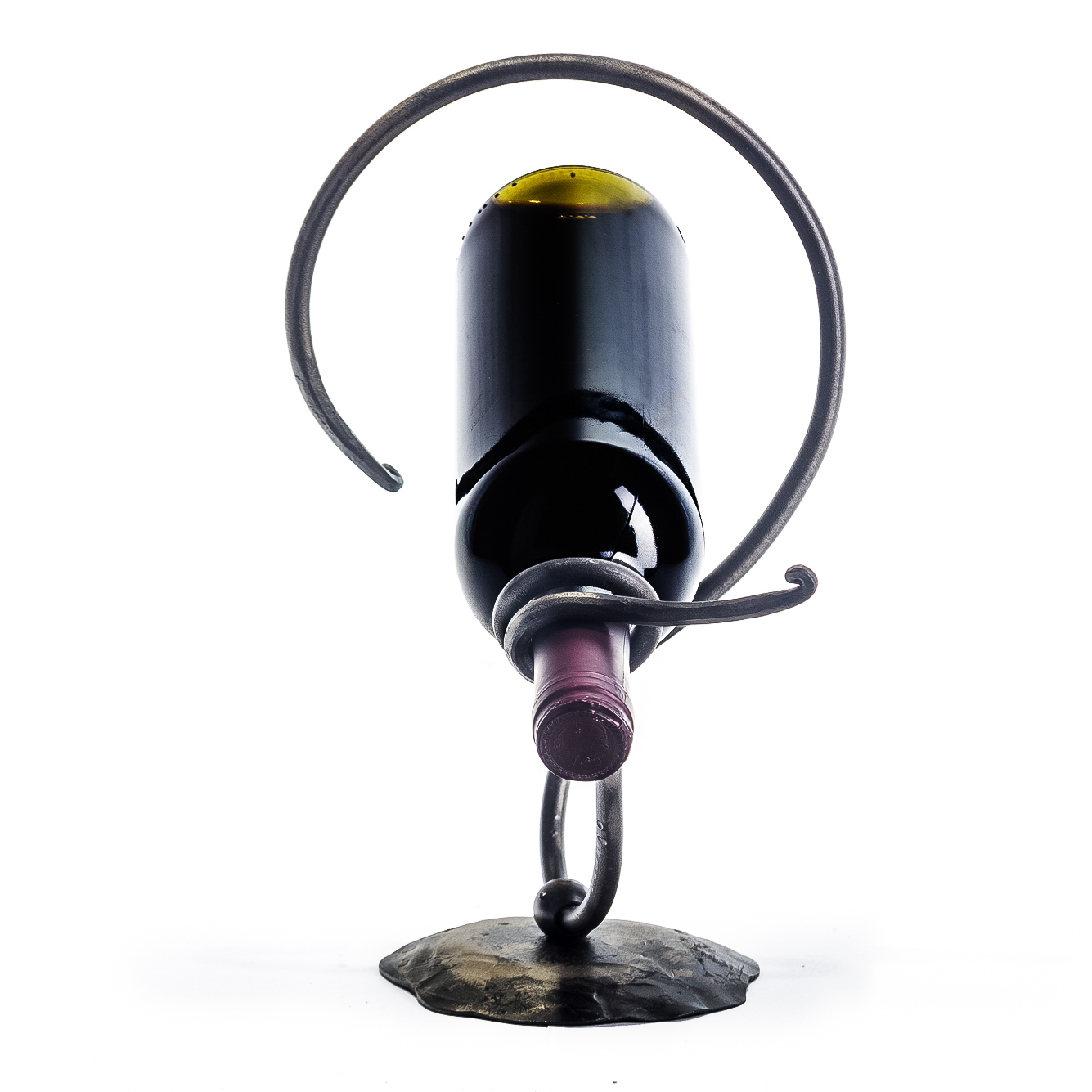 Portabottiglie da tavolo in ferro battuto con base circolare e sostegno a nastro intrecciato.